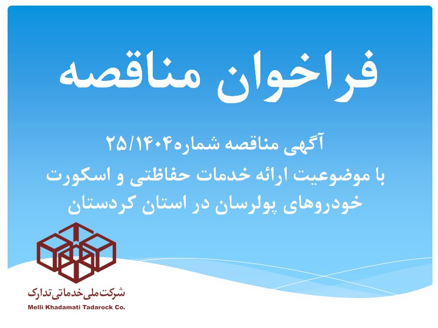شركت ملي خدماتي تدارك ( سهامي خاص ) در نظر دارد جهت دریافت خدمات حفاظتی و مراقبتی خودروهای پولرسان در سطح استان کردستان از طریق برگزاری مناقصه عمومی اقدام نماید.